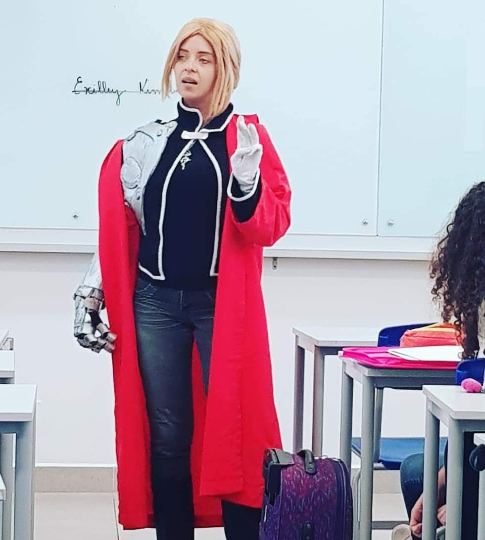 Thaiza Montine é professora de Química nas escolas de Goiânia. Embora seja uma cosplayer com quem tenho menos amizade, acho legal ver as fotos e vídeos dela em sala de aula, explicando a matéria e vestida com a roupa de algum personagem. Normalmente, são personagens relacionados à sua disciplina, como exemplo Eijira Kirishima, de Boku no Hero, que manipula materiais, ou então o alquimista Edward Elric, de Fullmetal Alchemist.